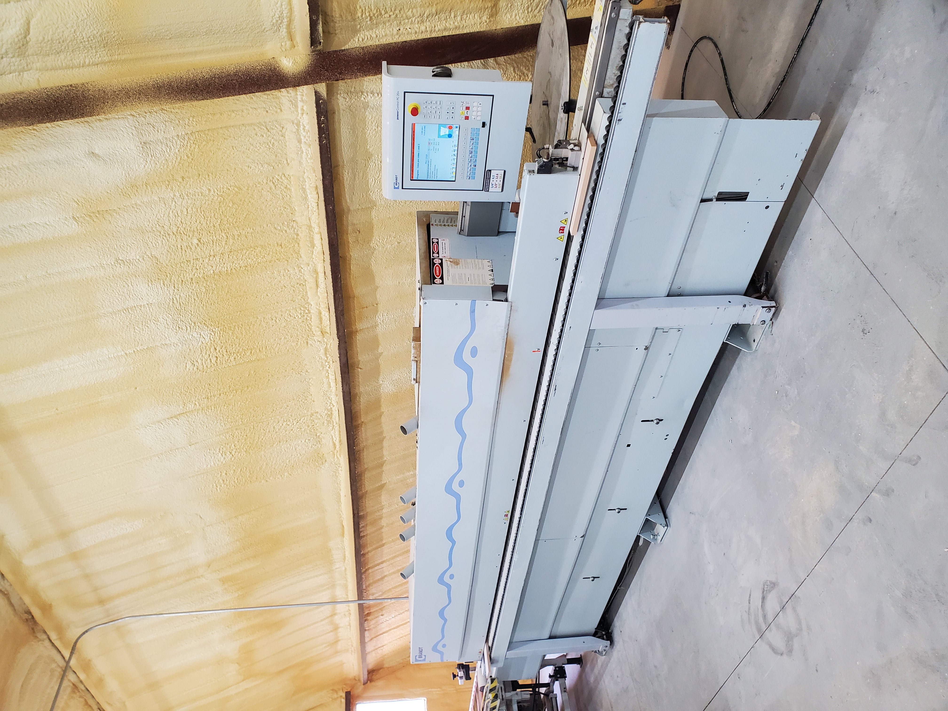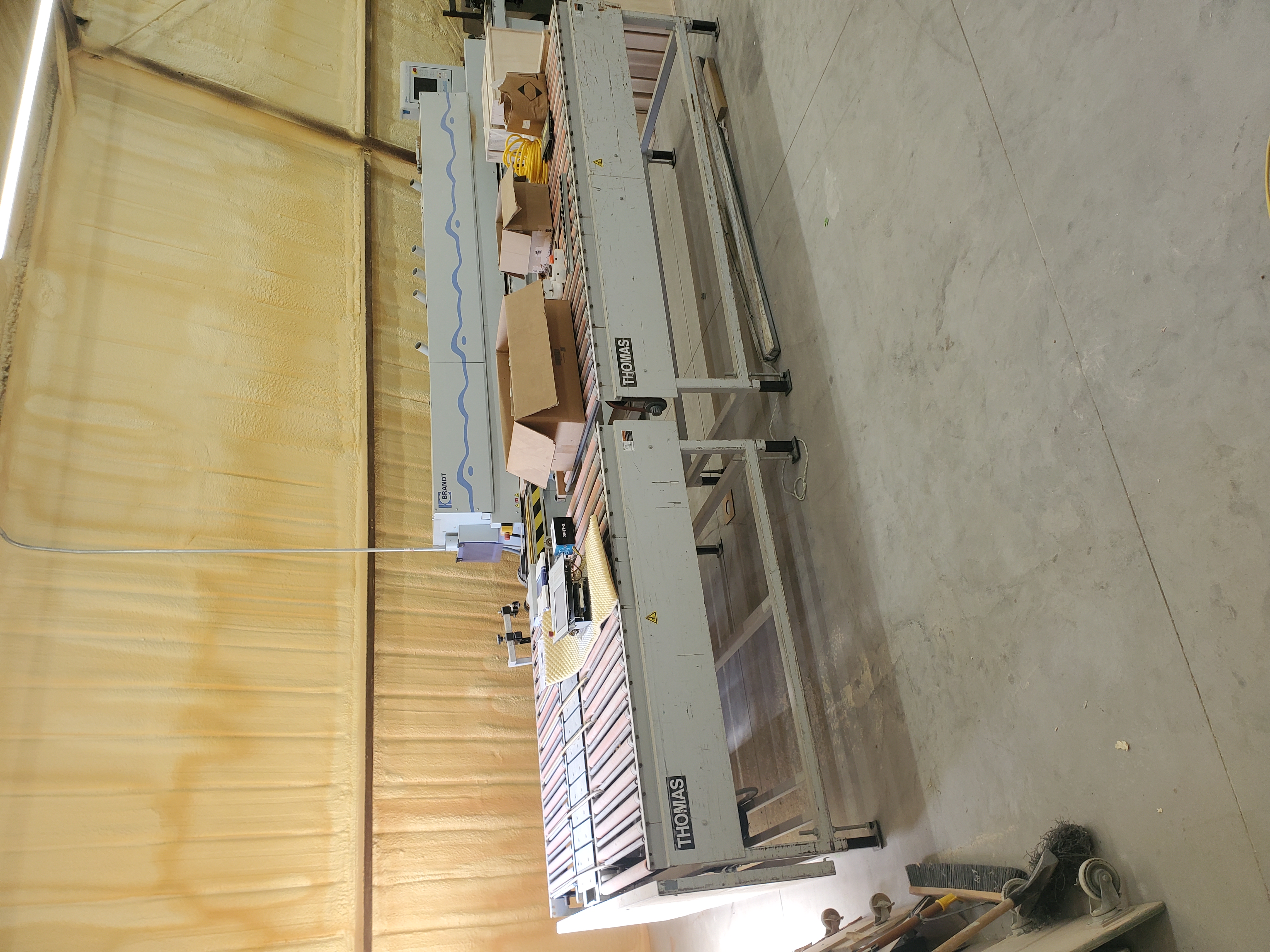 Edgebander with premill. Needs repair, is throwing some codes, but as far as I know is mechanically sound. Hood is damaged also. Includes Thomas return conveyer in good condition.