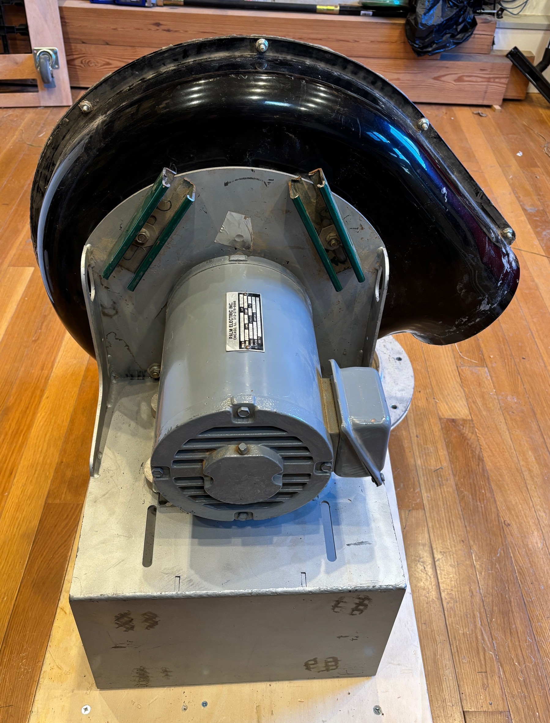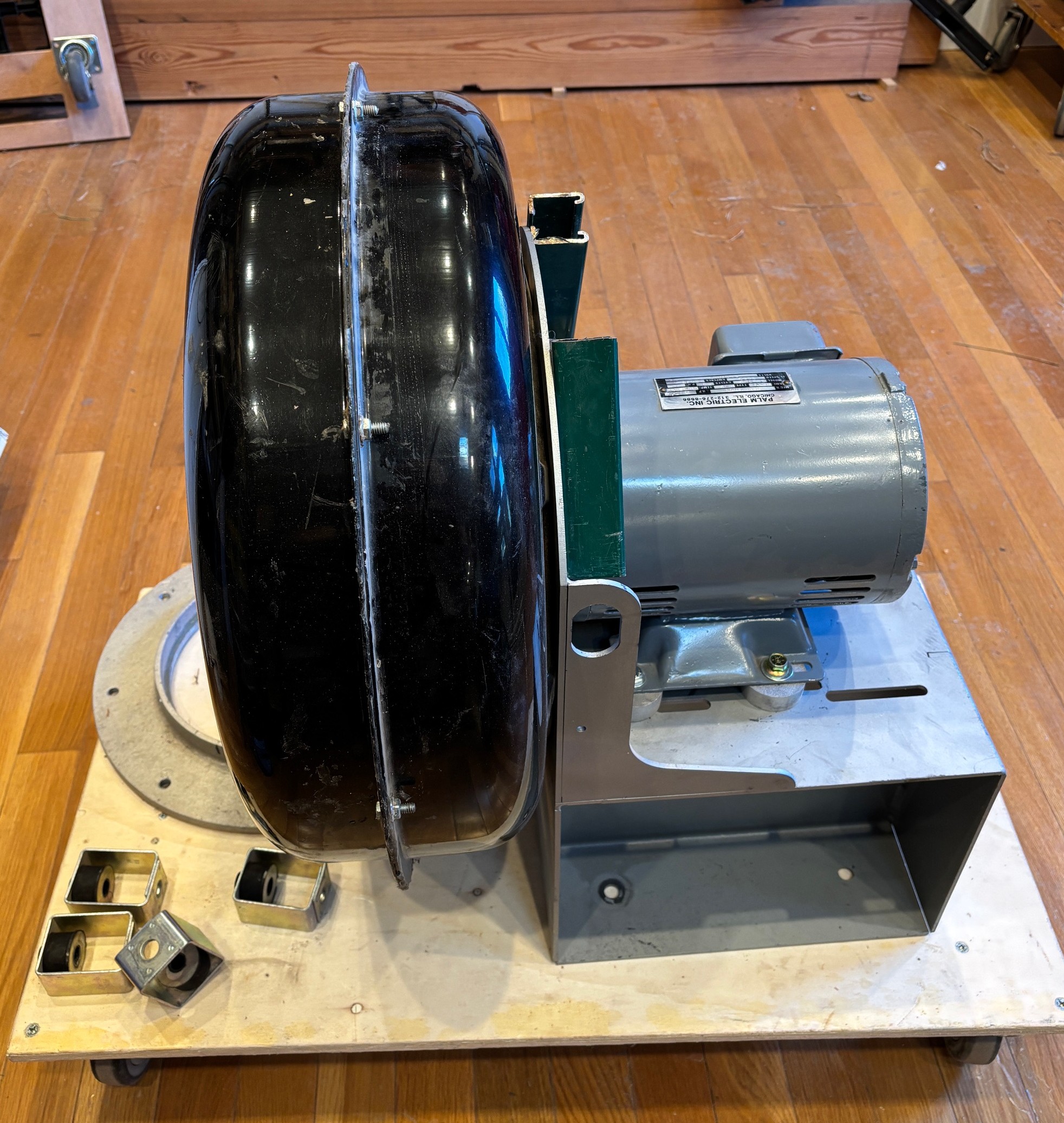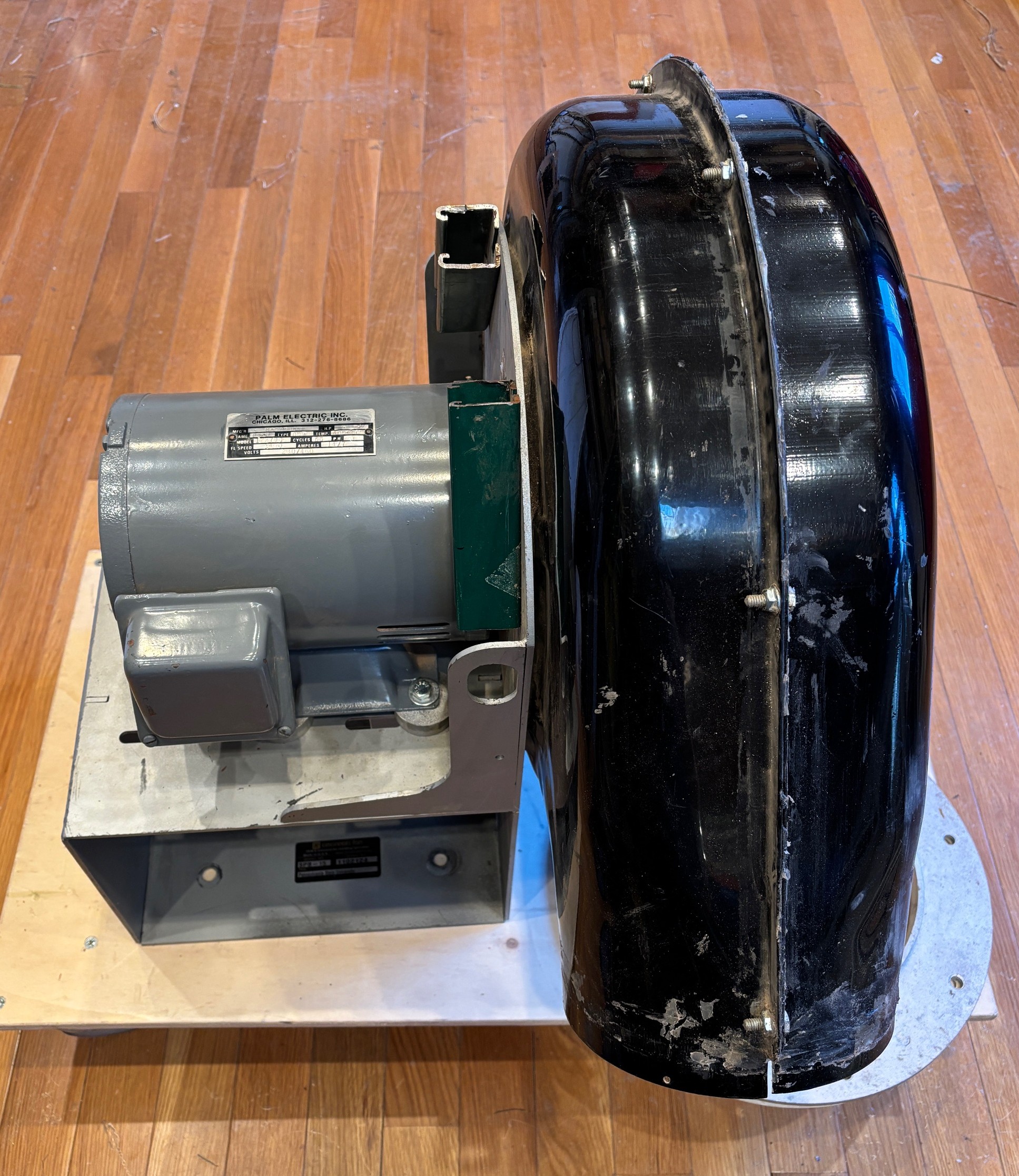 Similar to Cincinnati Fan PB 15 15.5" x 5" backward curved impellor. 8" diameter exhaust. Intake is 12" diameter. Internal diameter of aluminum ring is 10". It is from another blower- holes don't line up with the steel shroud but it would be easy to drills holes that match. Also includes vibration reducing hangers. I ran the blower on top of a clearvue cyclone. It provided excellent dust collection for misc woodworking equipment (wide belt, 12" table saw, panel saw, etc) with an 8" main trunk and 6" drops (one blast gate open at a time).