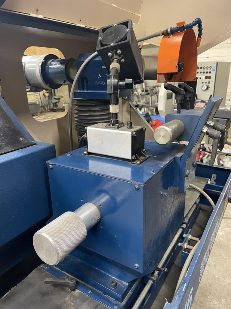 The G-716 Semi-automatic Cutterhead Grinder is used to sharpen 178mm to 406mm diameter eased edge, milled to pattern, and fingerjoint cutterheads. Worktable traversing is automatic and has adjustable stops. Cutterhead indexing is manual. Each knife is held against a positive stop while being ground !!!