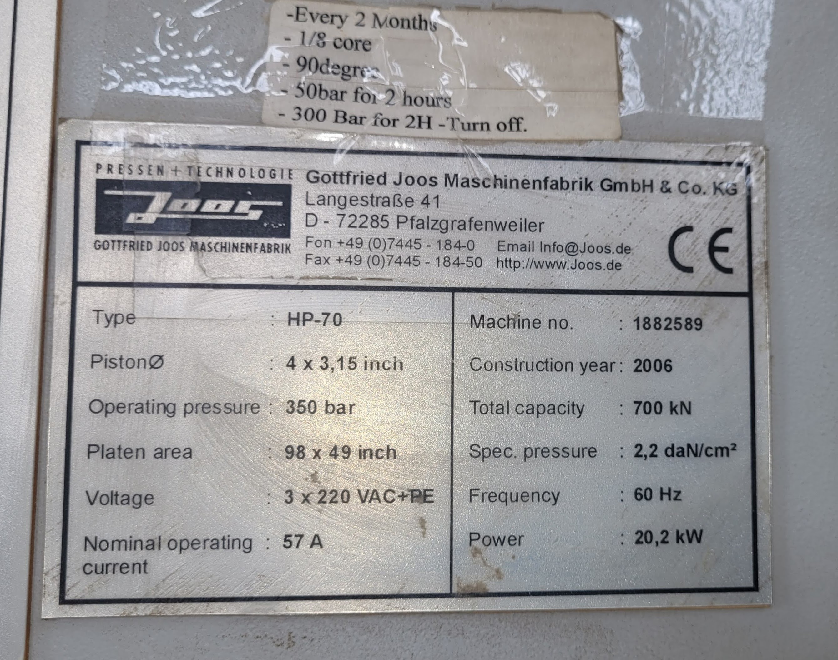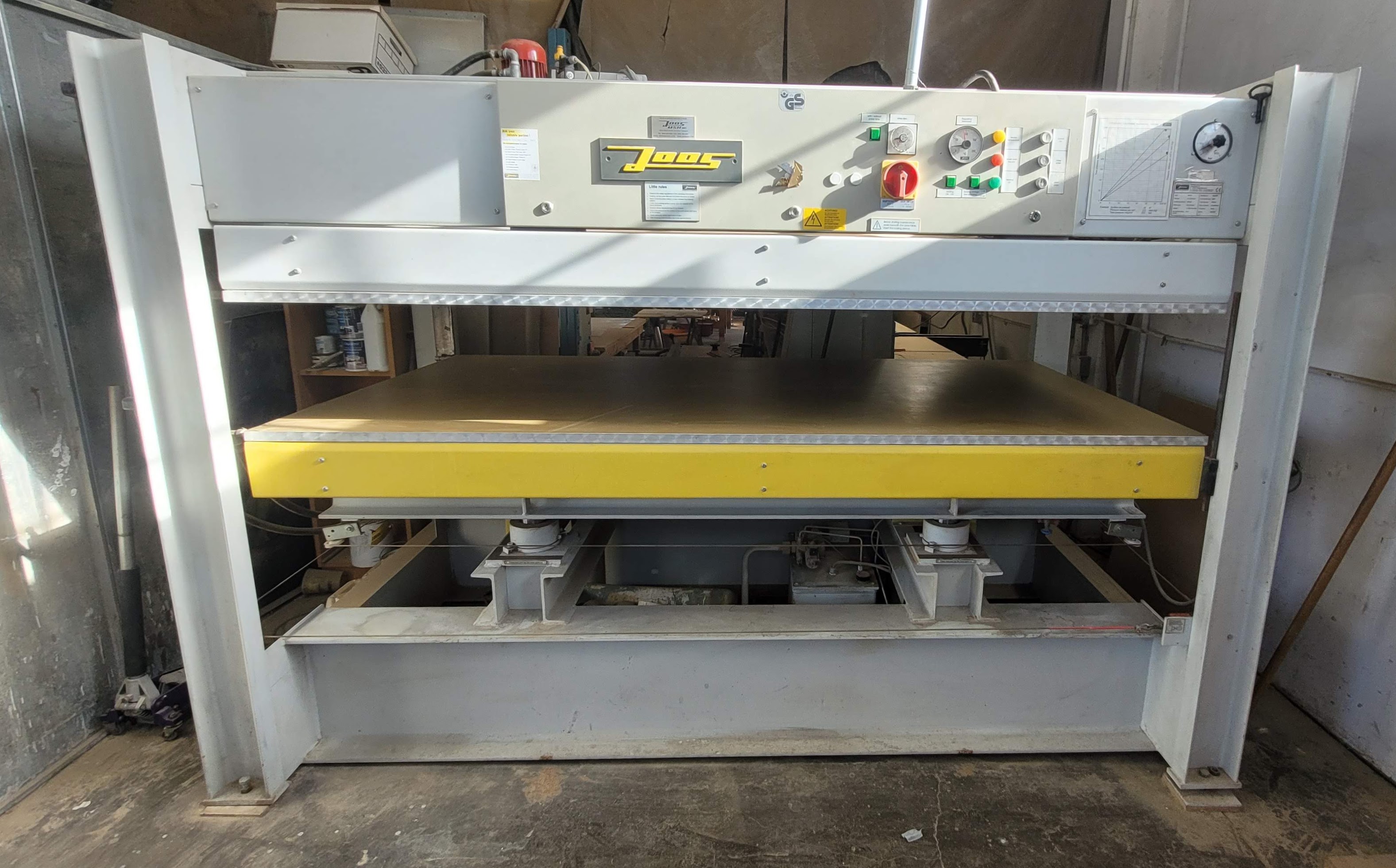 Key Technical Specifications (Joos HP 70):Total Pressing Force: 700 kNPress Surface Area: 2500 mm x 1300 mm (standard)Specific Pressure: (approx ) 2.2 - 3.5 daN/cm² or kg/cm² (depending on specific model/area)Operating Pressure: Up to 350 barHeating Type: Hot Water (Ökotherm) or electric heating platensMax Temperature: Up to ~85°C (standard water)Daylight Opening: 350 mm - 400 mmCylinders: 4 cylinders, 80 mm diameter