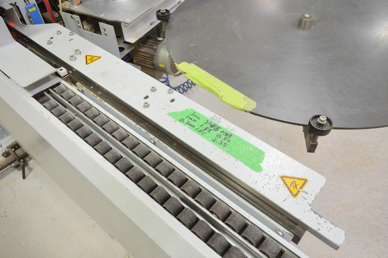 End trim, flush/bevel/radius trim & corner rounding stations have HF motors with electronic brakes; feed chain track speed 42 FPM, 2 HP feed drive.