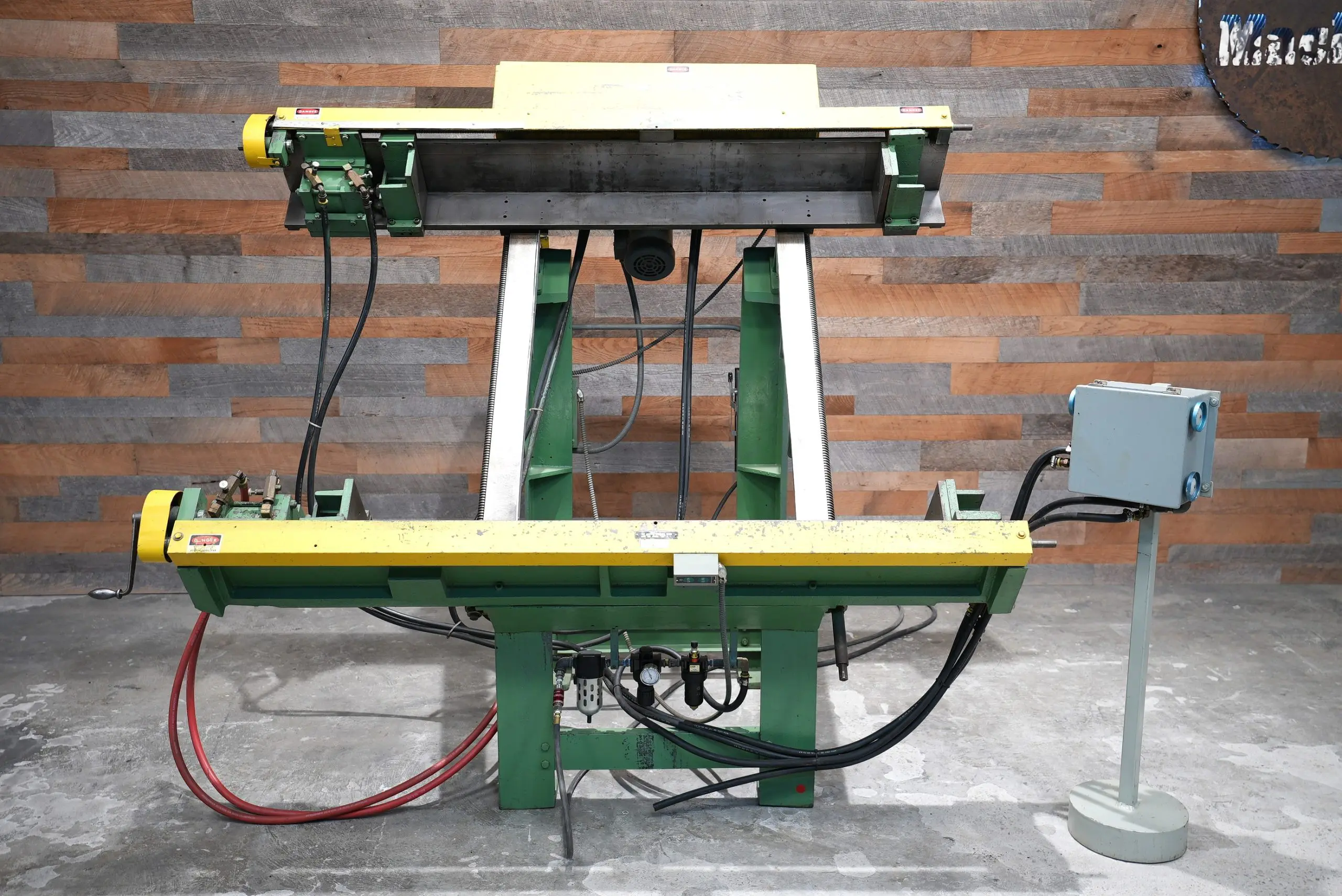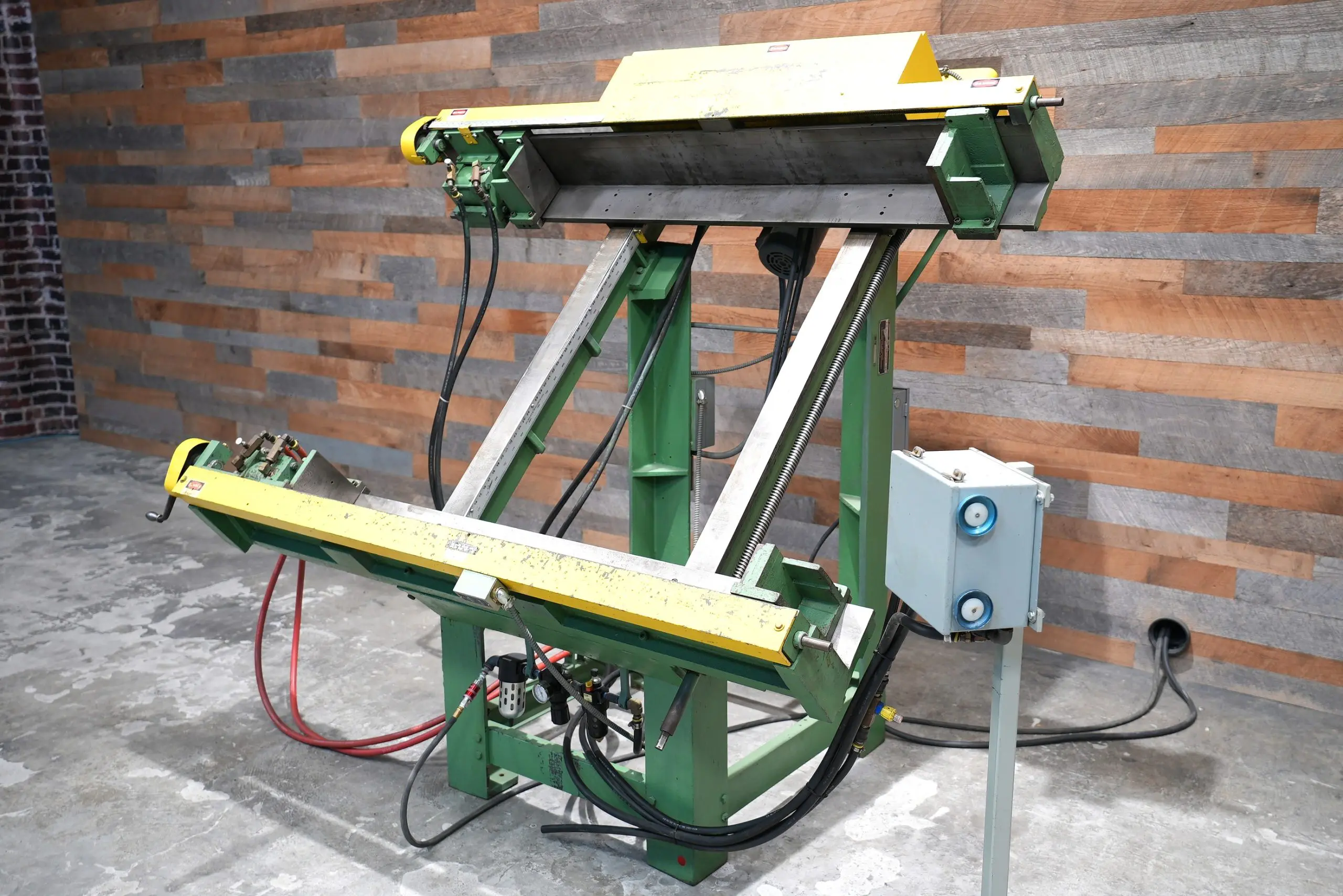 This Lancaster 1861-B Two Way Frame Clamping Machine features a 52″ tall X 56″ wide X a generous 8″ deep. (minimum 15″ tall X 11″ Wide) It’s hard to find clamps that are this deep. The horizontal adjustment is motorized by a quit running 1/2 hp 208-220/440V/3_phase motor. While horizonal clamps are hand driven at both ends. Meaning they both move at the same time so adjustment time is halved. This clamp has a 30 degree working angle. Pedestal with double palms and speed controls for clamping. Overall nice condition for a Lancaster. Was refurbished and beds were re-ground at some point in it’s life.