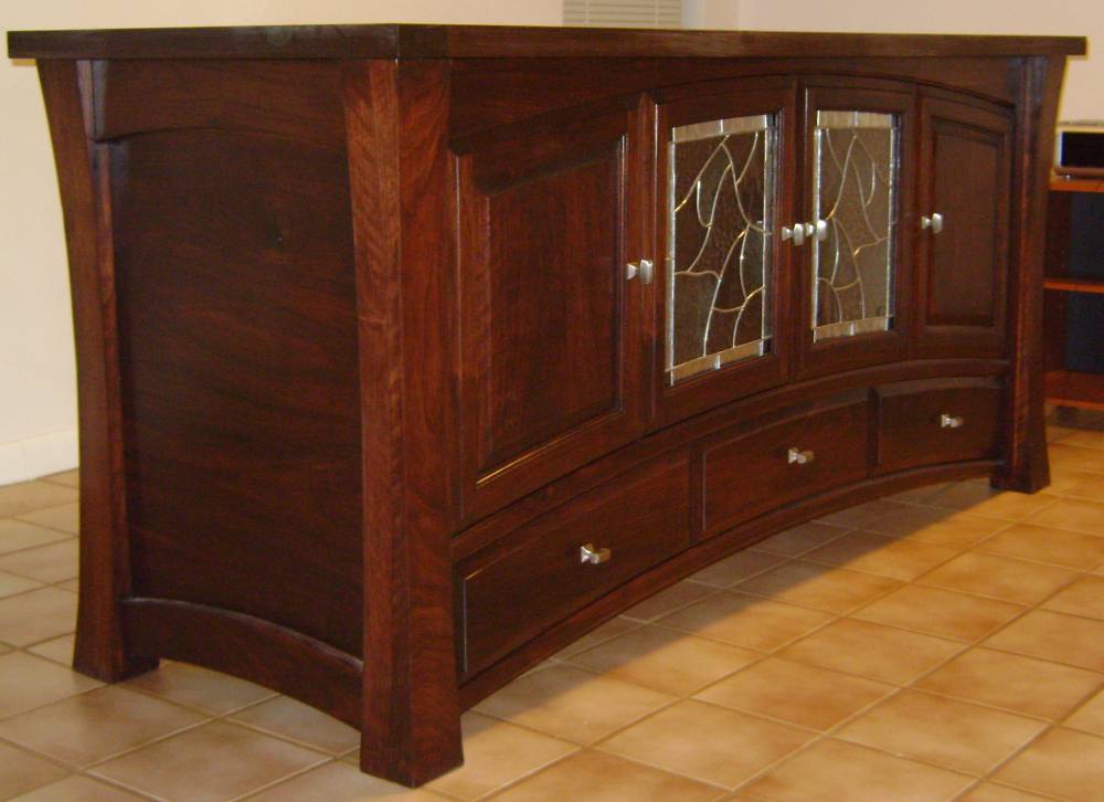 I started out wanting to build a entertainment console but I didn’t want to limit the use of the piece so I combined many different dimensions so it would go anywhere and serve as what ever the customer wanted it to be. I also combined many different furniture styles so it would have a sense of originality and to show off my creativity. I designed the interior components (without sacrificing strength of course) to be totally removable, I did this so I would have the ability to make changes to the storage configurations based upon the customers wants and needs. If purchased as an entertainment console it could be converted into something else later on down the road with ease. Even though it started as an entertainment console I could easily make it a dresser, a sideboard , and with an addition of a cabinet on top it could make a beautiful cupboard. I also designed it to be finished on all four sides so it could sit in the middle of a room as well as up against a wall. The dimensions are (Width:69 ¾”, Height: 33”, Depth:26 ½”) The drawer boxes are curved to follow the curve of the rest of the piece. I also designed the glass to give it sense of elegance. The doors where a huge challenge it took a whole day to do four doors: I didn’t see that one coming. I took many ideas and put them together to make this piece, I was entering into a whole other playing field armed with only my ideas and imagination. Never the less I took off with this project, figuring out ways to make each piece of this cabinet employing templates and spoke shaves to shape each piece to fit. I spent one hundred and seventy six hours on this project but it was worth every second. Also if anyone reading this has any knowledge on how to get some exposure or how to get my work out there then I would like to know about it. Right now I am waiting to be able to rubout the top but when it is done I need a way to show it off. I built this piece as a show piece and it dosent do me any good sitting in my house.