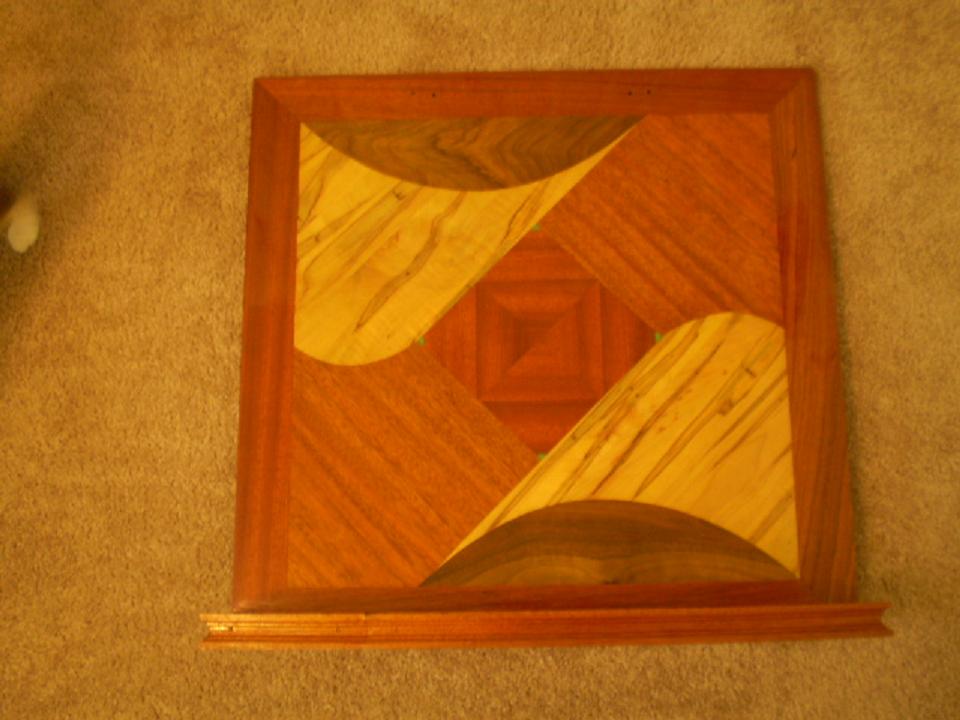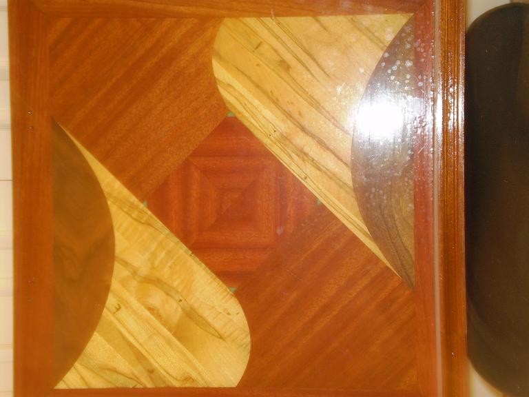 Material: Ambrosia Mapel; African Mahogany; Domestic Walnut, Brazilian Cherry (dead center of the piece)- Frame and ledge piece: Mahogany.This is full 3/4" stock pieced together..., not inlay work