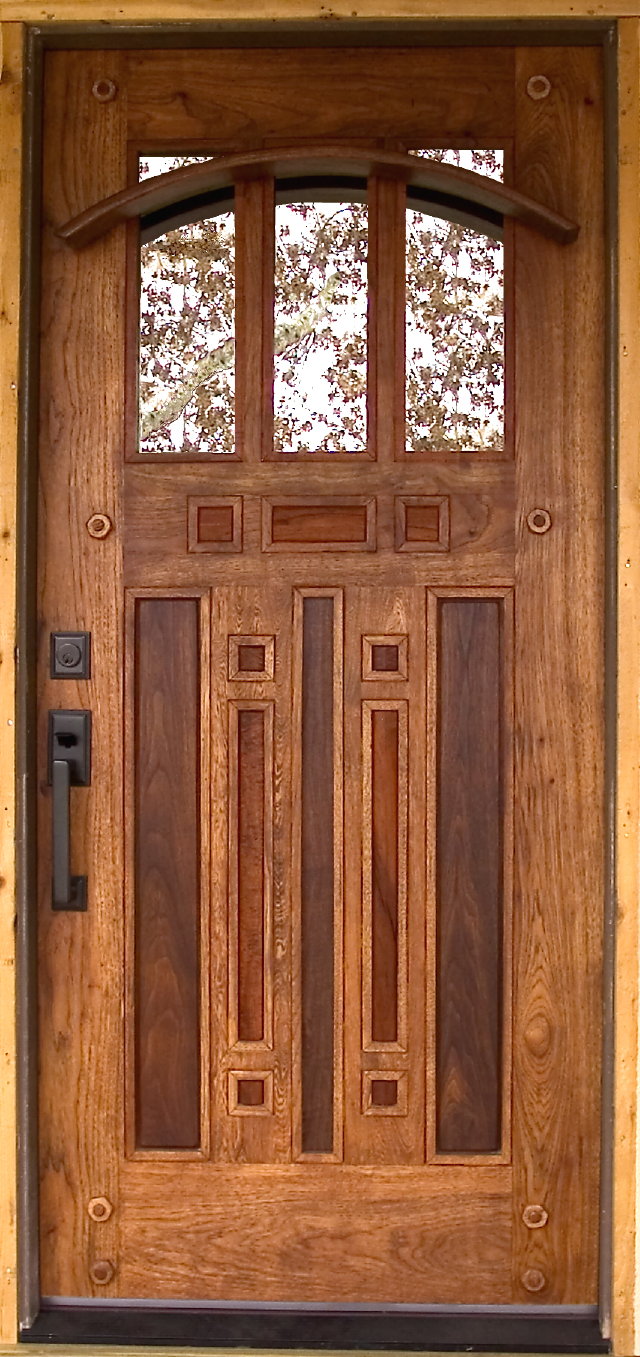 Pecan stiles and rails, Walnut flat panels, mesquite pencil point panels (photo does not show pencil point well), Bronze reflective glass, Walnut bent wood eybrow w/ Pecan nuts and bolts, Tung oil finish