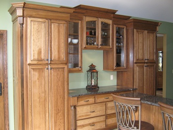 hickory kitchen with double crown. every trick included; pot/pan rack, spicerack, microwave drawer, swingout pantries.
