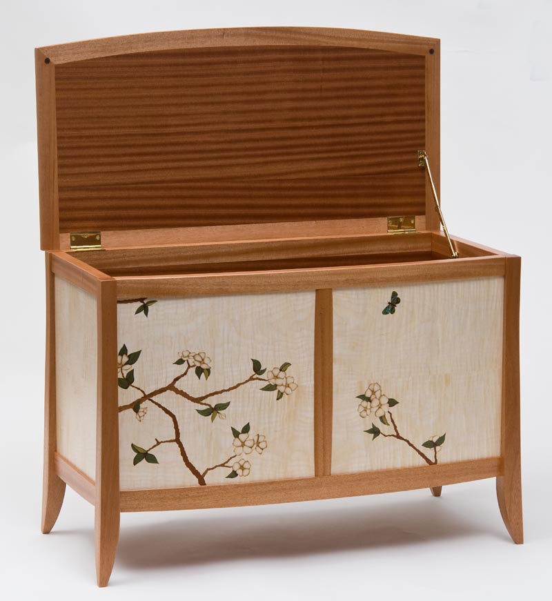 Dogwood flower marquetry decorates the front and top of the chest on a background of Curly Sycamore with Mahogany trim.