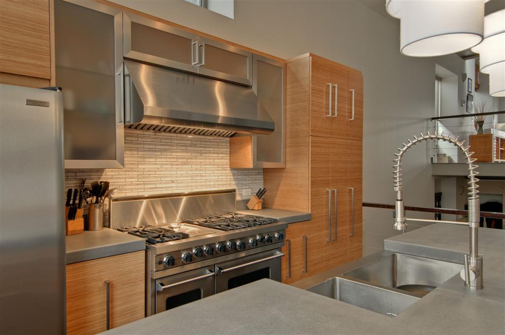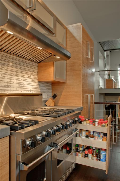 This kitchen is made of Solid 3Ply Bamboo. There is also a section of cabinets under the windows that is Maple stained a Dark Wenge. The kitchen has four Stainless Steel Doors with Glass surrounding the Stainless Steel Hood,a flip up Appliance Garage, pullout base pantry, and a Full Sized Pantry with Rollouts.