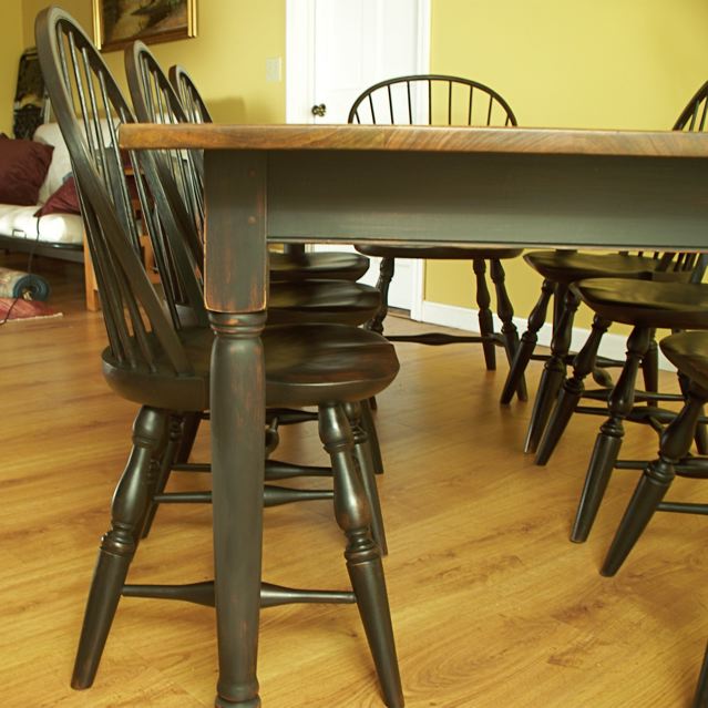 This is a set of six bow back windsors chairs, two sack back windsors chairs and a farm style dining table for a customer. Both the chairs and the table base have a distressed traditional milk paint finish with black over red color. The table top is a cherry (12"+), with an aged finish. The table is 84" long and 40" wide. This table and chair set was handmade in our two person shop. The building process videos for both the chairs and table are on our website on the current projects page.