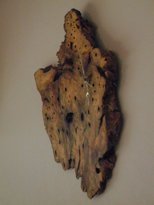 This simple wall clock is made from Buckeye Burl. The quartz mechanism is set in a mortise in the back. I chose not to clutter the face with numbers, so you only have the gist of what time it is when you look at it, which I think is just fine. It is frill-free and easy to enjoy the natural patterns in the grain.
