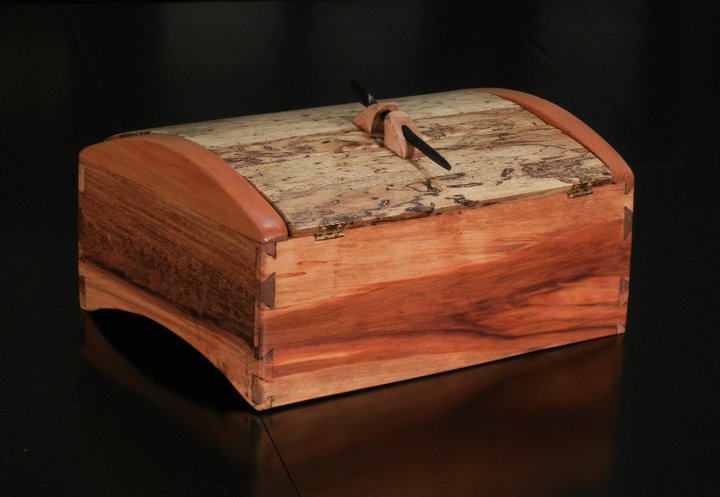 I made this jewelry box for my wife. It is made with cherry, spalted white oak, maple, and spalted mahogany. The lid was coopered with a “round plane” I fashioned from grinding down the iron of an old transitional plane and shaping it’s wooden sole to match to an even curve. I went through three different designs before landing with the coopered top. I had a few small boards of this weathered spalted mahogany which was filled with worm holes. Most of it was too funky to use, but what I was able to salvage was a delight to shape. The pin that holds the lid closed is ebony. The box is finished with oil, polish and wax. The lid is french polished.
