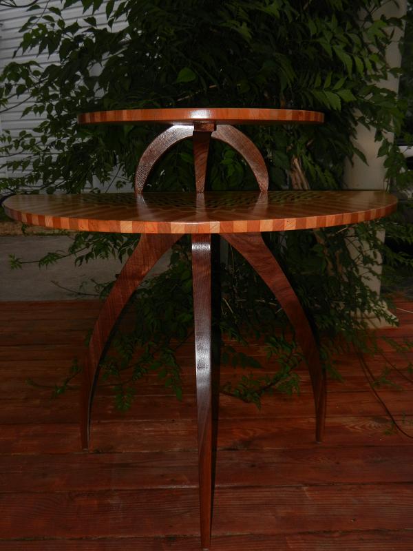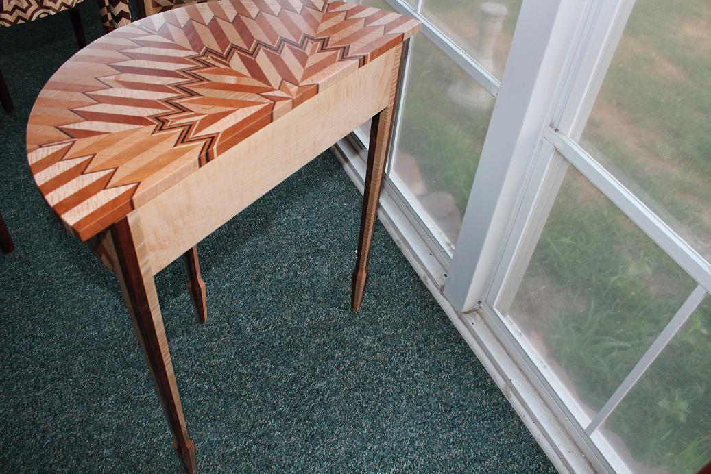 Solid wood with multiple pieces of wood. Wenge, hard curly maple, walnut, cherry etc. The aprons of some are sculpted. The finish is a precat lacquer.