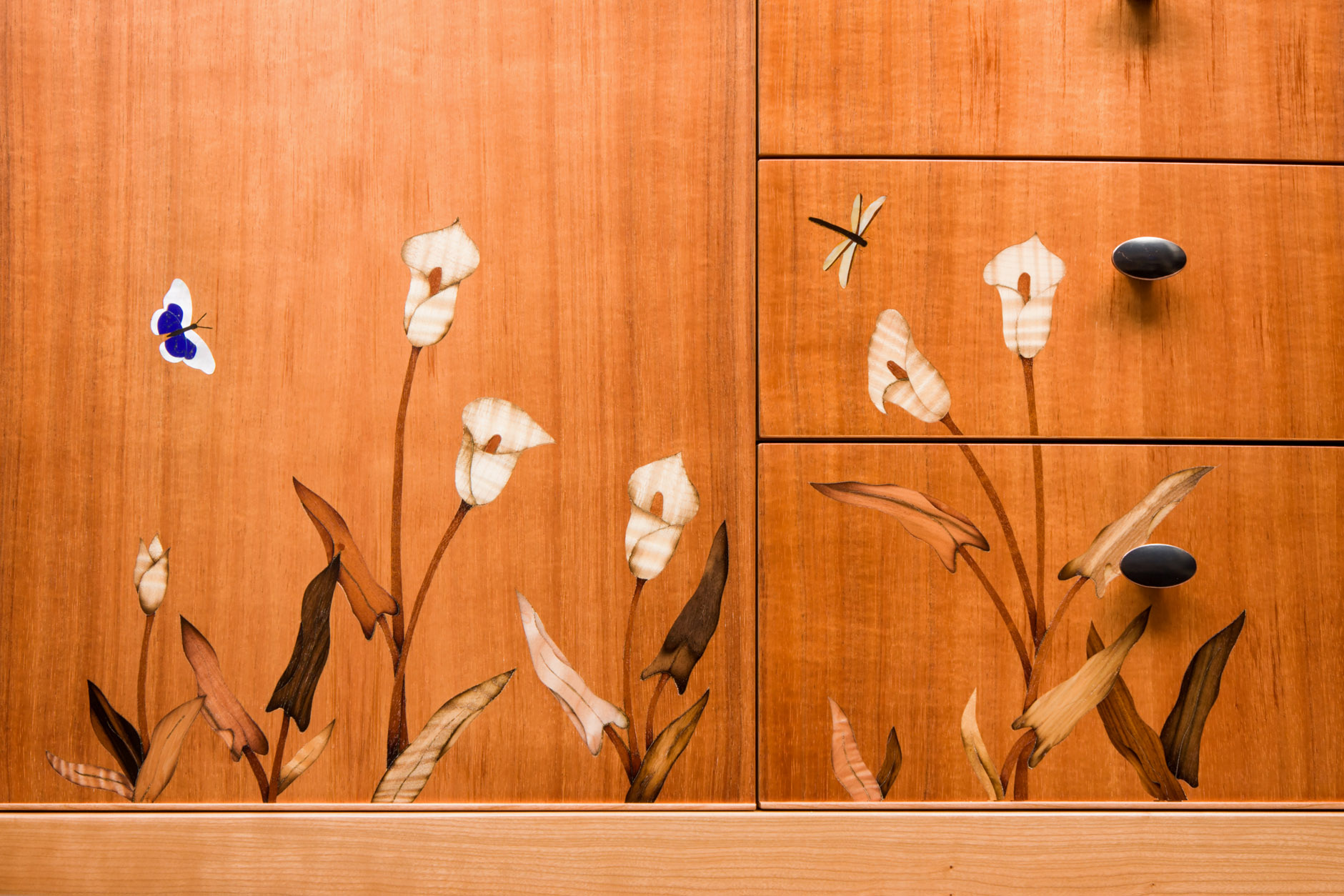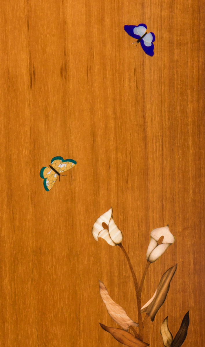 The marquetry on the china cabinet was designed to be more subtle than that on the buffet so there are fewer flowers and they are much smaller. The flowers wrap around the right side of the cabinet. As it is placed in the room you walk by the right side of the china cabinet and the left side of the buffet so the flowers are fully visible on both pieces. The butterflies on this piece are Mother of Pearl, silver and blue reconstituted stone for the blue one and a mix of several types of reconstituted stone and Ebony for the green one. There is also a dragonfly in Mother of Pearl and wood on the far left.