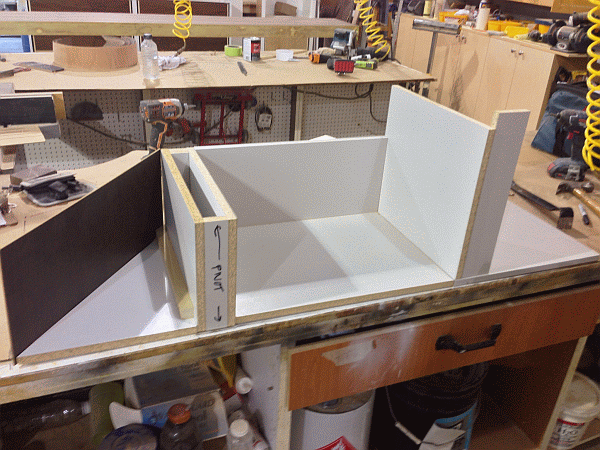 To the question of the particleboard construction; that is just the model mockup to see if the pivot pin systen would work. I used plywood to build the actual cabinet. We could not have an end wall on the left side because then it would look like a serate unit when closed. The client wanted it to look like one long unit with the 3" thick columns joining the 3/4"shelves.