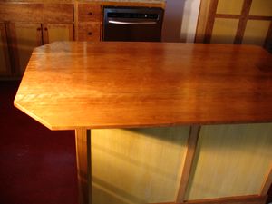 Her best bet is probably to hand rub Bio Poly NT, a couple coats, with some Looking Glass Beeswax Polish for a topcoat and for maintenance. These will be gorgeous, simple and mild enough for her to do herself. It can get wet for a while with no maintenance but not if left overnight. I did a nice cherry center island in a kitchen like this (below). It gets high use every day. It's been five years and it's still in great condition. The homeowners say they put the beeswax on it once or twice a year.