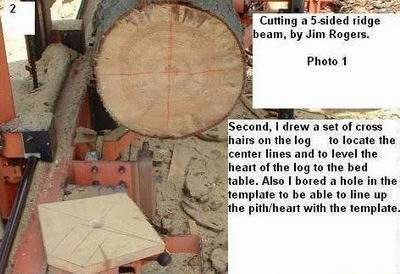 Looking at photo 1, you’ll see a full scale end view template made from a 1” pine board. I used my framing square with the buttons attached and a layout triangle that has degrees and roof pitch scales on it, to draw the pentagon-shaped template. After drawing the template, I bored a hole through the center of the crosshairs to be able to sight the heart/pith on the log.