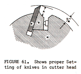 4. Use Proper Knife Projection. The recommended distance for a knife to project out beyond the head proper is 3/16". A safe rule is to never allow a knife to project out beyond the length of the cutting bevel, and at the very extreme should not project more than 1/16" beyond the bevel. See figure 61 on page 64. K is the knife. H is the head body. G is the knife gib. When machining green lumber the distance A should be greater than for dry stock. When the gib G shows excessive wear from contact with the knife it should be replaced. Several types of planers are equipped with portable grinders. Since the knives can only be ground a limited amount by these portable grinders before re-setting, it is a temptation for the operator to project the knives beyond the recommended projection in order that the knives may be ground for a longer period without re-setting. Too much knife projection or worn knife gibs, due to excessive projection, frequently causes the knives to break and fly in all directions.