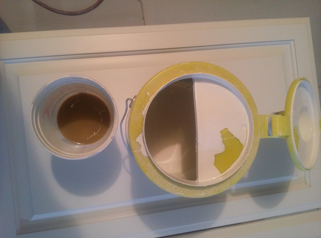 As you can see from the first picture the leftover paint in the quart cup turns brown after sitting for some time, but when re-stirred it goes back to its original color as seen in the gallon can.