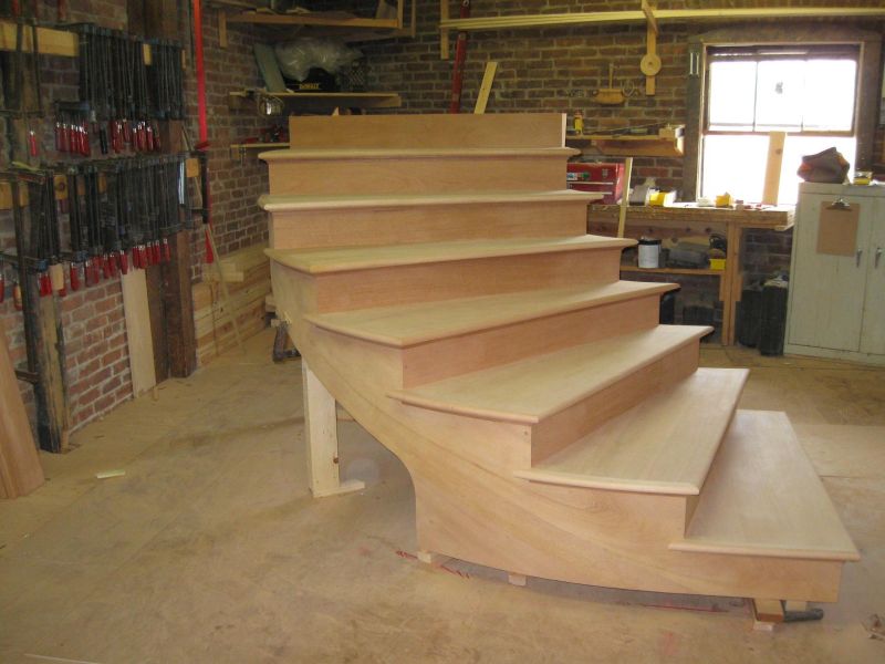 Thanks. Straight construction-type stairs use 1 1/2" material (2X 10 or 2 X 12); I was planning to make the curved stringer about 1 1/2" (either out of plywood or thin strips of some kind of solid wood). I tend to think of laminations; has become a natural way for me. The curved caps will be done this way.