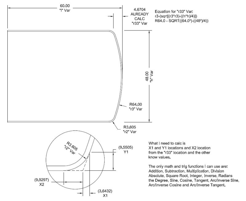 That would do the math for the x and y start point. You could shorten the .8688631269. But the longer, the more accurate the formula. If you shorten it to 4 digits, then the start and end points are off by about .030 in x and y. Just trying to give you options. I would personally use the first formula. It is more accurate at 4 decimal places. This is the standard accuracy for most machines.