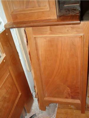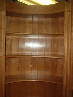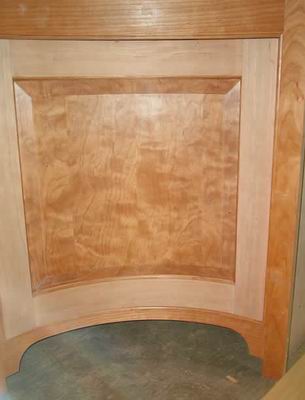 Except for the curved doors and the big one between them, all the door panels and wainscot panels were raised from single boards, adjacent doors from the same board. The counter is one board 18 1/2" wide. All sides and shelving (except the corner shelves) are one board. As usual, Rick of Hearne Hardwoods, came through again with some gorgeous cherry. Narrower boards were ripped for the backs. Expansion problems are discussed later in the "Installation" section.