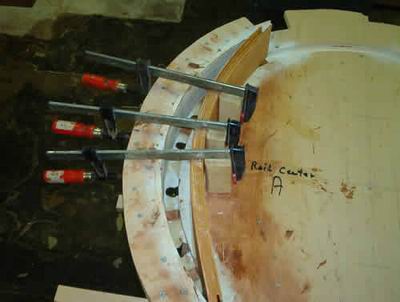 This initial dado was used in conjunction with a big pattern bit to cut the rest of the plies making up the form. You may note that the dado had pads in the bottom to hold the rails off the bottom, and holes for the epoxy squeeze-out to drain. The white was pigmented shellac. The entire form was liberally paste waxed, as well all the back of the first ply and face of the last ply, prior to glueup.