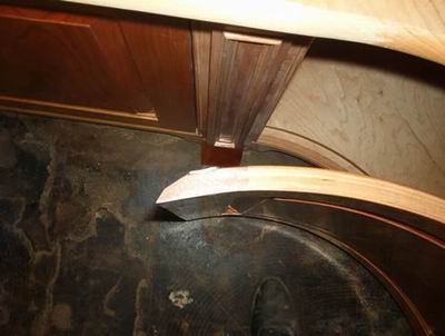 The outermost slots fit into the upper units' face frames, and an addition to the perpendicular legs was hot melted on to account for the larger radius. We then repeated the same proceedure with the tops of the upper cabinets. The bottoms of the uppers could not move since they were attached to the tops.
