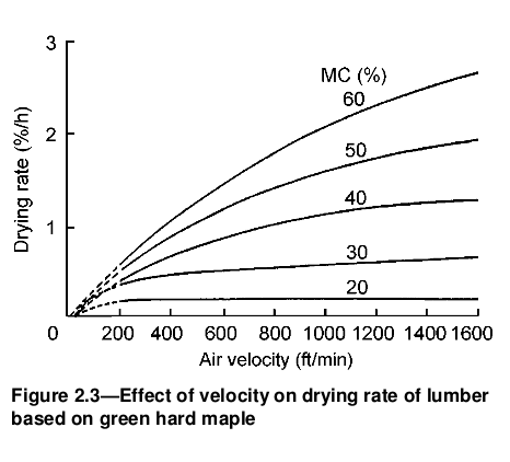 Let's assume that you've previously air-dried the lumber down to 30% MC. As you can see in the attached image, at low MC and low air speeds, the drying rate is proportional to the air speed. So if the air speed is cut in half, the drying rate is half. All of this helps a lot with solar powered air circulation, since a lot of drying can still be done with low power, and 1/10th the power still dries about 1/2 as fast.