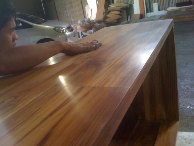 I recently finished a gorgeous thick timber teak wood floating console cabinet in a contemporary style. The client would have been perfectly happy if I had used a typical two coat post-cat or Conversion Varnish, but it was an expensive piece and I could not live with myself knowing it left my shop 90% perfect. So I spent three days spraying, brushing, and leveling and finish a perfect finish. Definitely not in the budget! The piece is really very nice and will be grabbing the attention of visitors for many years.