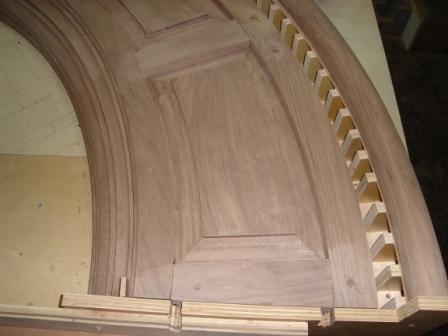 We recently bought a US Concepts radius moulder, and tonight I ran a radius casing made from yellow pine. I used a stack laminated method like a butcher block and then the arch was cut from that. It made a mess. I really do not have the time to strip laminate and run it that way. Does anyone have any ideas or has anyone done this type of machining using my method? One of my competitors uses the same method and his seemed to come out fine. His arches were cherry and maple. Could I wet the wood and then machine it and sand it afterwards? My knives were sharp, by the way. Feeding the arch from left to right the cross grain leading into the head did fine and the cross grain machining away from the head tore out.