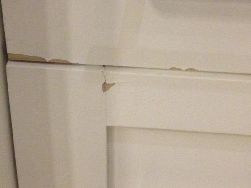 As of late (last year or so) a few of our projects have started doing something very peculiar. The finish on some of the doors/drawers (only on some projects) has started to chip off – see images below. I'm thinking it may have something to do with the clear finish product that we apply once the stain or paint is dry. I'm really guessing here though and I'm hoping that someone out there has encountered and rectified this issue before and can provide some insight for us. Obviously this is not the type of recurring issue any woodworking company needs. I'm desperate to get to the bottom of this and any help would be greatly appreciated.