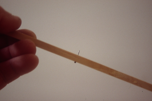 Then I carefully drill a pilot hole slightly smaller then the diameter of the brad, and drive a brad through the stick. I like to sharpen the brad point for a near razor like scribe line: